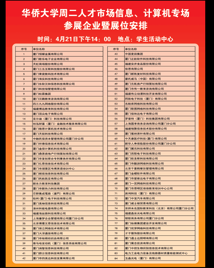 4月21日Bwin必赢网址信息、计算机星期二人才市场招聘会参会企业名单公布 时间:4月21日下午14:30 地点:凤凰苑服务楼三楼员工活动中心